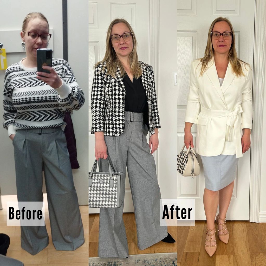 We went through her current wardrobe and put together several smart-casual outfits that suit her new figure while highlighting her professional and